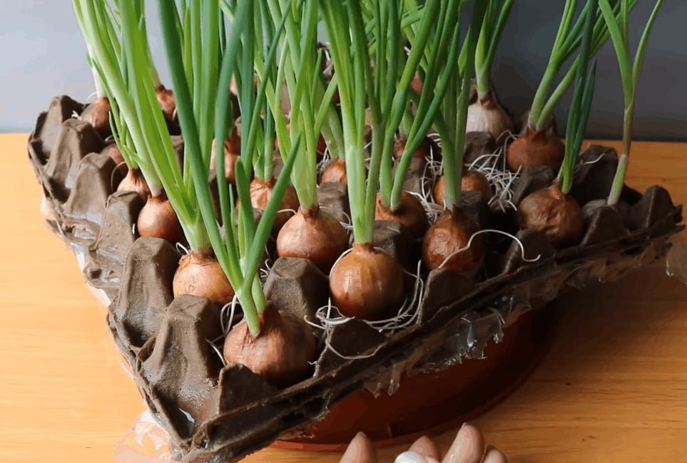 Comencemos con un método sencillo y práctico. Forra una caja de huevos con papel celofán y asegúralo. Luego, coloca algunas capas adicionales de cajas de huevos y remoja bien la capa superior con agua. Luego, simplemente coloca cebollas del tamaño adecuado en cada hueco.